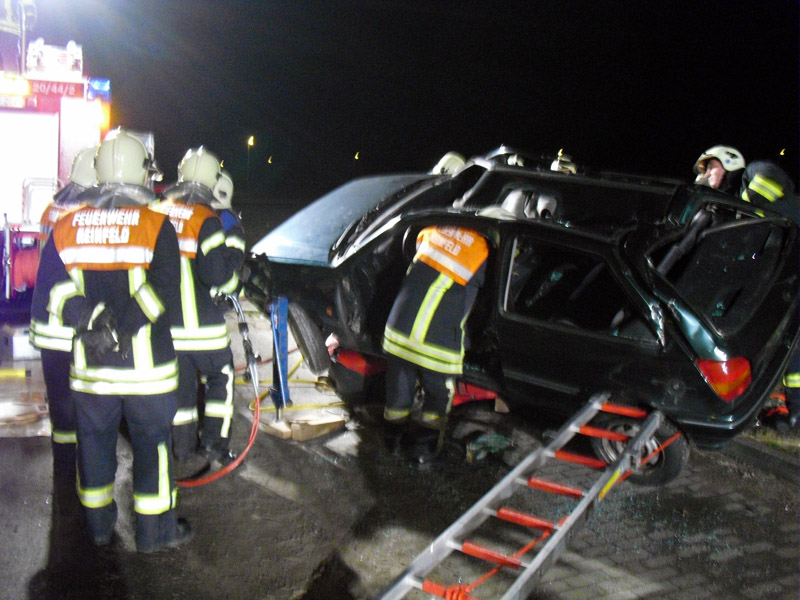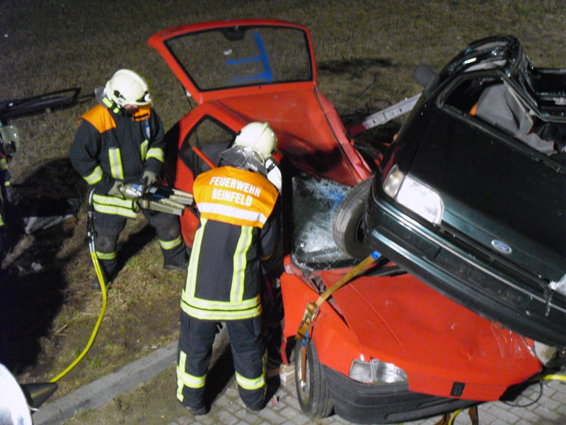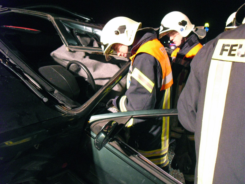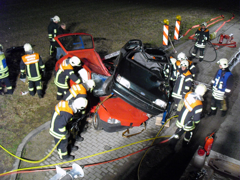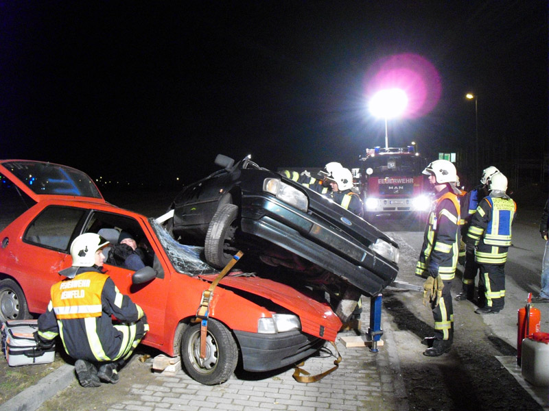 Angenommene Lage war ein Verkehrsunfall mit mehreren eingeklemmten Personen, bei dem sich ein PKW überschlagen hatte und den zweiten teilweise unter sich begrub. Die Lage wurde ruhig und souverän angearbeitet. Die Mitglieder der Jugendfeuerwehr übten sich als Verletztendarsteller.