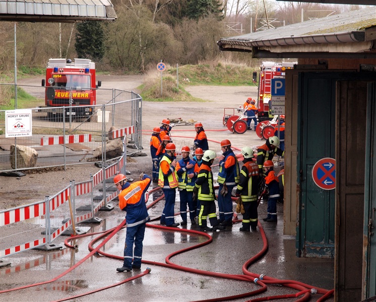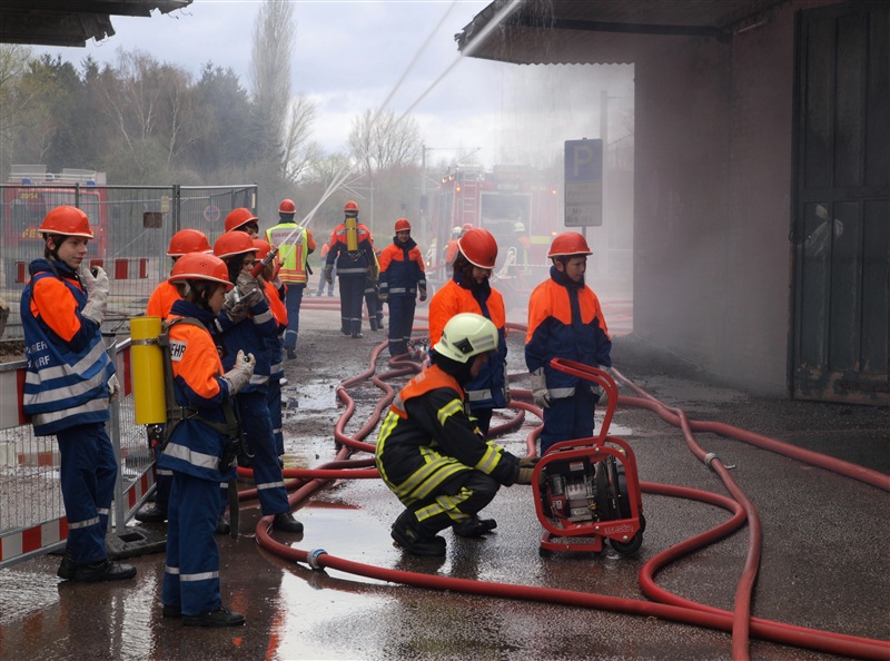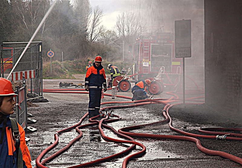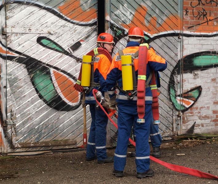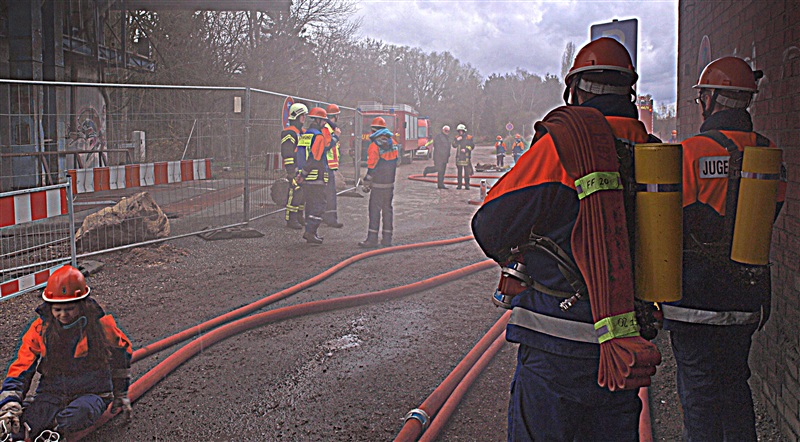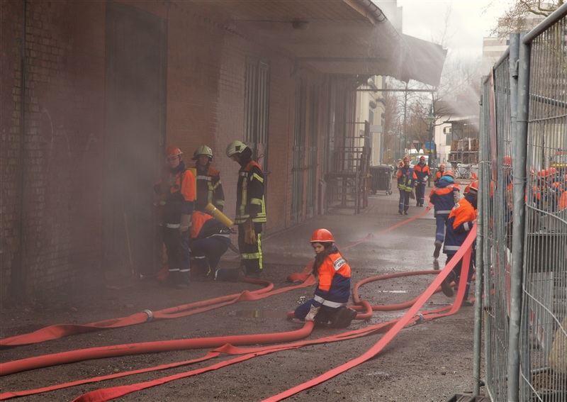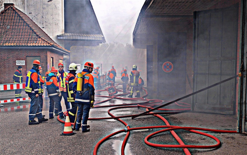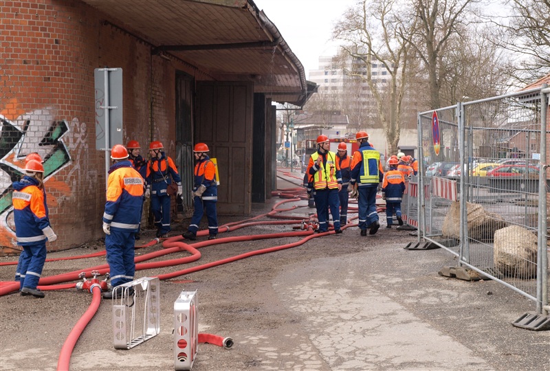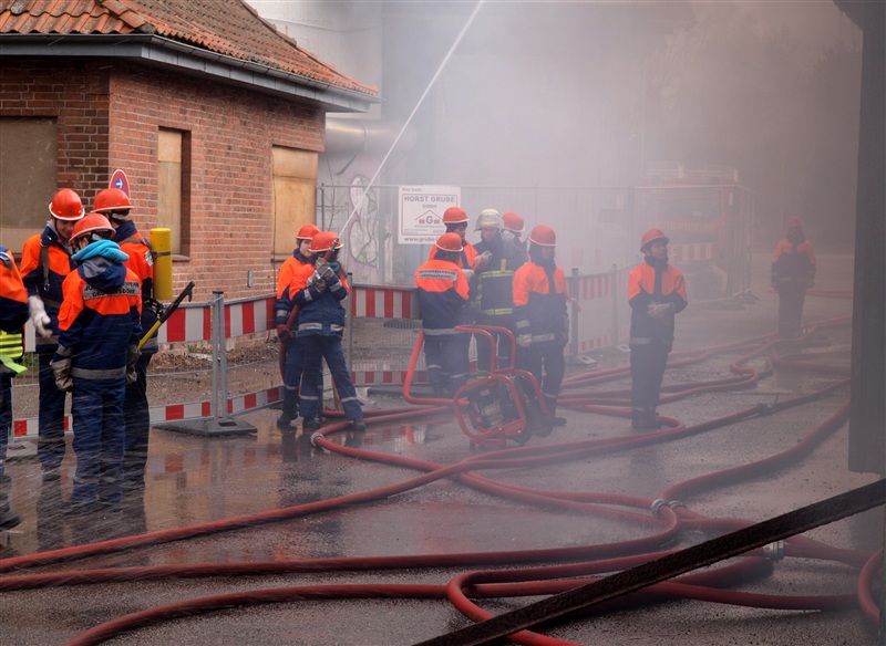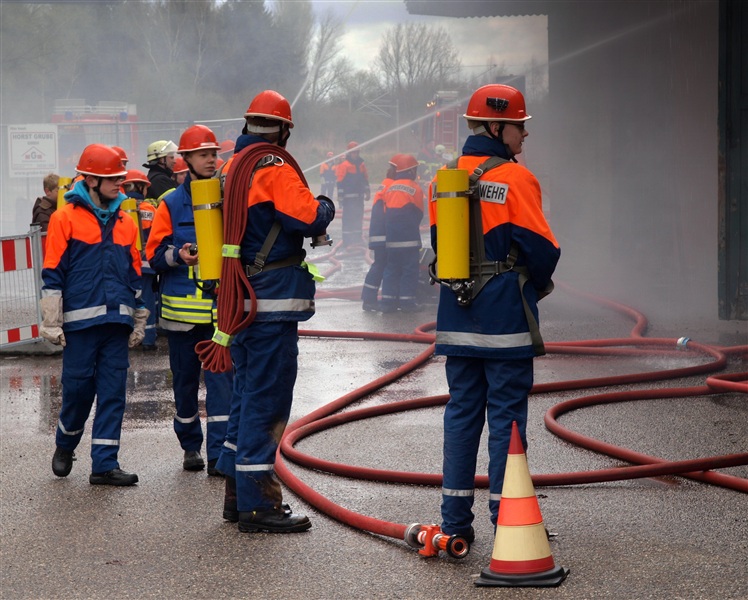 "Rauchentwicklung aus Lagerschuppen" war das Einsatzstichwort, zu dem die Jugendfeuerwehr Reinfeld und die Jugendfeuerwehr Großhansdorf am heutigen Samstag alarmiert wurden. Noch auf der Anfahrt wurde der Einsatzleiter von der Übungsleitstelle darauf aufmerksam gemacht, dass sich noch Personen im Gebäude befinden würden. Am Einsatzort angekommen, bestätigte sich die gemeldete Rauchentwicklung. Nach einer kurzen Besprechung mit den Gruppenführern kam auch schon der Befehl "Angriffstrupp zur Menschenrettung vor". Nachdem ein Trupp den Zugang in das Gebäude mithilfe eines Bolzenschneiders ermöglicht hat, konnte der Angriffstrupp in den Lagerschuppen vorgehen. Kurze Zeit später kam über Funk die Meldung, dass eine verletzte Person gefunden wurde. Diese wurde ins Freie gebracht und weiter betreut. In der Zwischenzeit wurde ein Außenangriff mit zwei C-Strahlrohren vorgenommen. Außerdem gingen zwei weitere Trupps in den Lagerschuppen vor, da noch eine weitere verletzte Person im Gebäude vermutet wurde, was sich wenig später bestätigen sollte. Auch diese Person wurde gerettet. Als darauf das Feuer gelöscht war, wurde der Rauch mithilfe des Überdruckbelüfters aus dem Gebäude "gepustet". "An alle Einheiten, Übungsende, Rückbau" war die letzte Meldung, mit dem der Einsatzleiter die Übung beendete. Letztendlich stellte sich herraus, dass drei Kinder in dem Gebäude gezündelt haben, wodurch ein Feuer ausbrach. Ein Junge konnte sich selbstständig retten und rief die Feuerwehr.