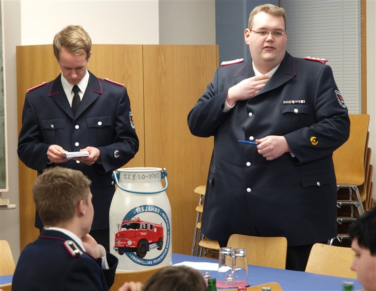Am Freitag, den 15.02.2013, fand die Jahreshauptversammlung der Jugendfeuerwehr statt. Die Versammlung begann mit eröffnenden Worten des Jugendgruppenleiters Nils Backhaus und des Jugendwartes Gerd-Heinrich Riemann. Bevor die Gäste ihre Grußworte loswerden konnten, wurde die Beschlussfähigkeit durch den Schriftwart festgestellt. Es stellte sich heraus, dass wir mit 18 anwesenden Stimmberechtigten beschlussfähig waren. Als 7. Tagesordnungspunkt stand die Verabschiedung von zwei Jugendfeuerwehrmitgliedern an. Lars Brüß und Nicolas Puls, die beide jahrelang in der Jugendfeuerwehr tätig waren, wurden mit einem kleinen Präsent aus der Jugendfeuerwehr verabschiedet und anschließend in die Einsatzabteilung übernommen. Außerdem verabschiedeten wir unseren engagierten Betreuer Reiner Laurer mit einem Andenken an die tolle Zeit in der Jugendfeuerwehr. Nächster Tagesordnungspunkt waren die Wahlen, bei denen der Jugendausschuss neu gewählt wurde.