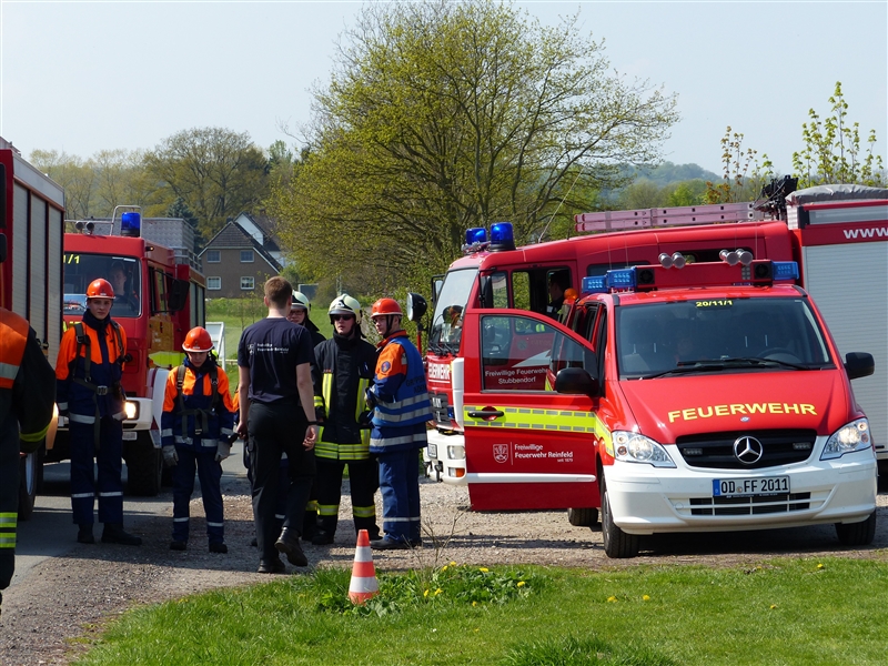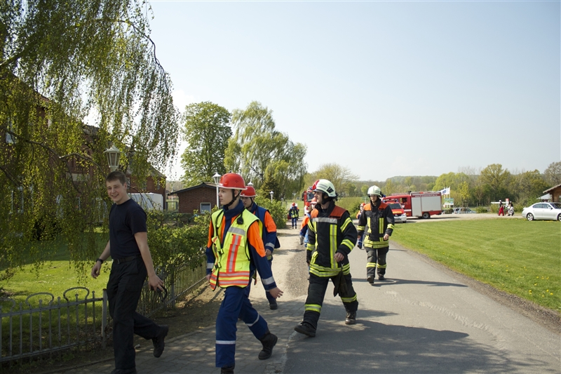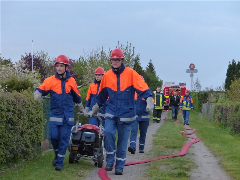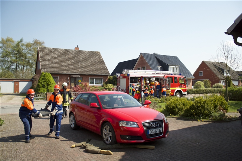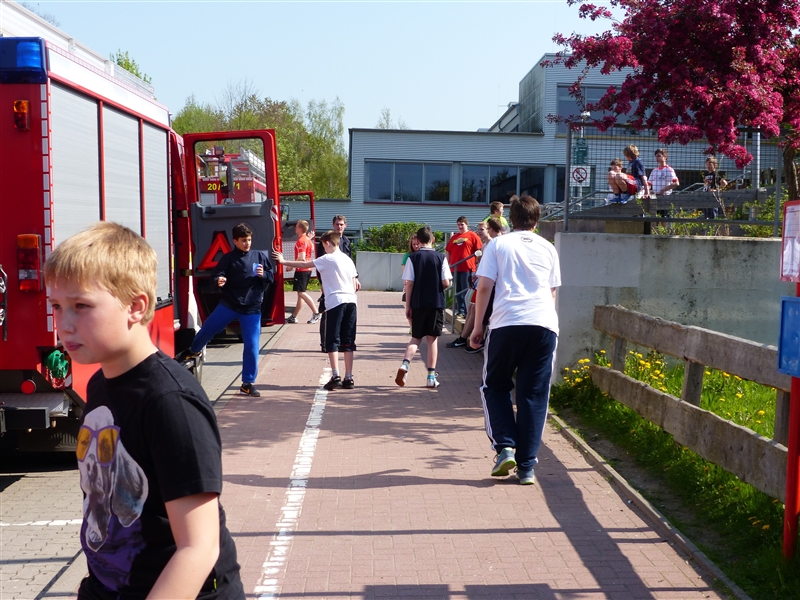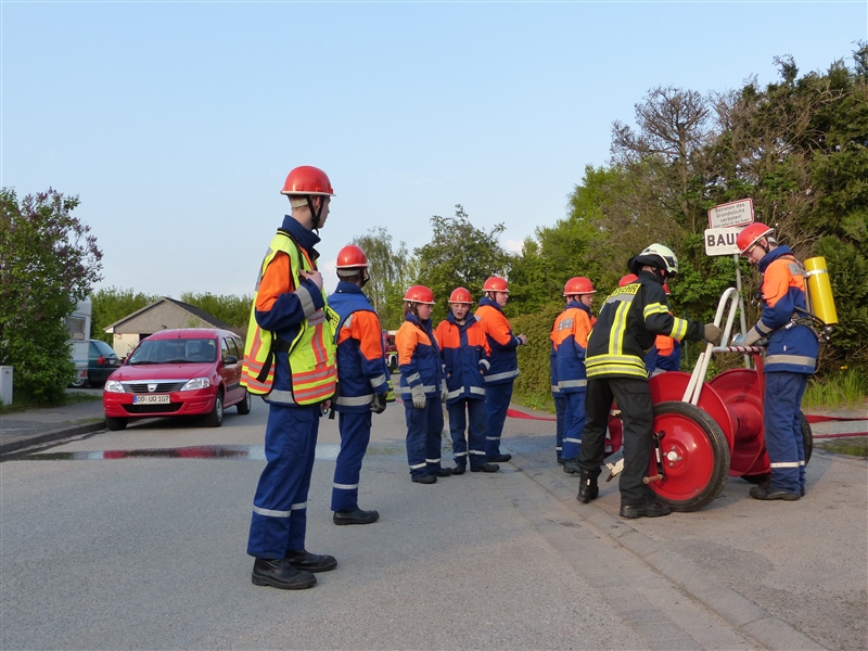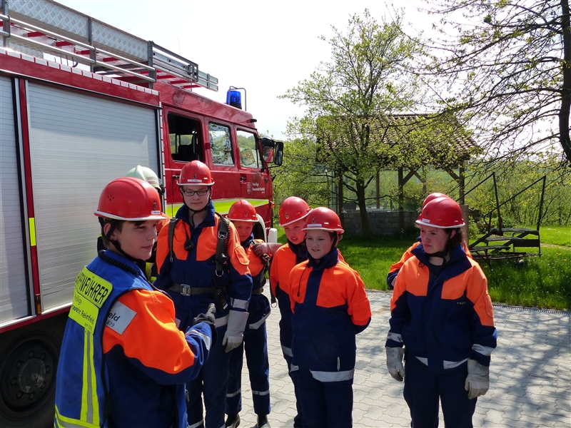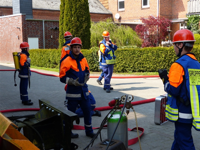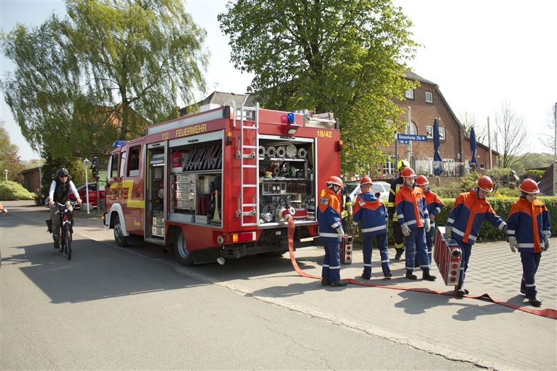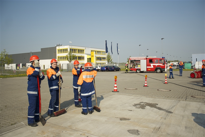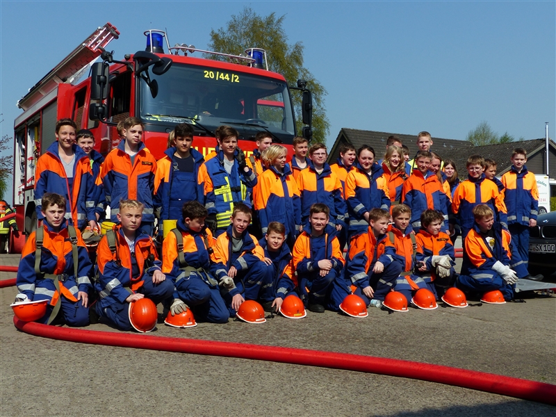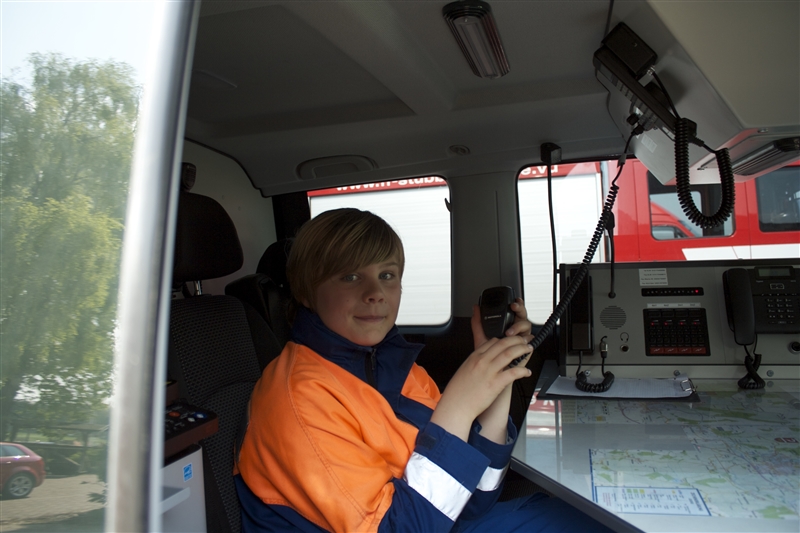 Um 9 Uhr stand die zur Berufsfeuerwehr umfunktionierte Jugendfeuerwehr mit 26 Jungen und Mädchen zum Antreten und zur Aufteilung auf die Löschfahrzeuge auf dem Hof bereit. Zusätzlich zu der regulären Besetzung der Löschfahrzeuge gab es dieses Jahr auch die Funktion der Pressesprecher, die während der Einsätze die Presse betreuten und sich um die Aufzeichnung größerer Einsätze kümmerten.