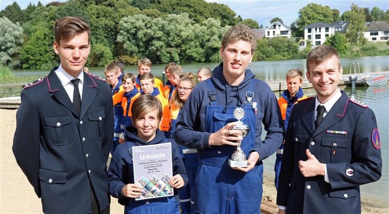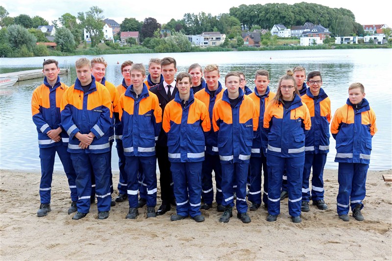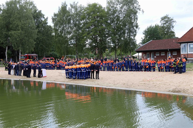 Zu einem Jubiläum gehört natürlich auch eine Feier. Diese startete am Sonntag Vormittag mit einer Rallye rund um den Herrenteich. 17 Jugendwehren aus Stormarn, sowie die Jugendabteilung unserer Partnerstadt Neubukow mussten in diesen Wettkampf insgesamt sechs Stationen mit verschiedenen Aufgaben, wie zum Beispiel das Flechten von drei Schläuchen auf Zeit, meistern und wertvolle Punkte sammeln. An ihrem Ziel in der Badeanstalt angekommen, sorgte der ASB Bad Oldesloe mit Gyros, Pommes und Krautsalat für eine ordentliche Stärkung der Teilnehmer.