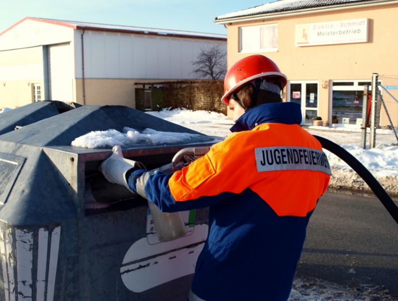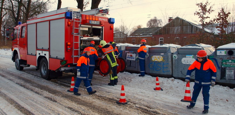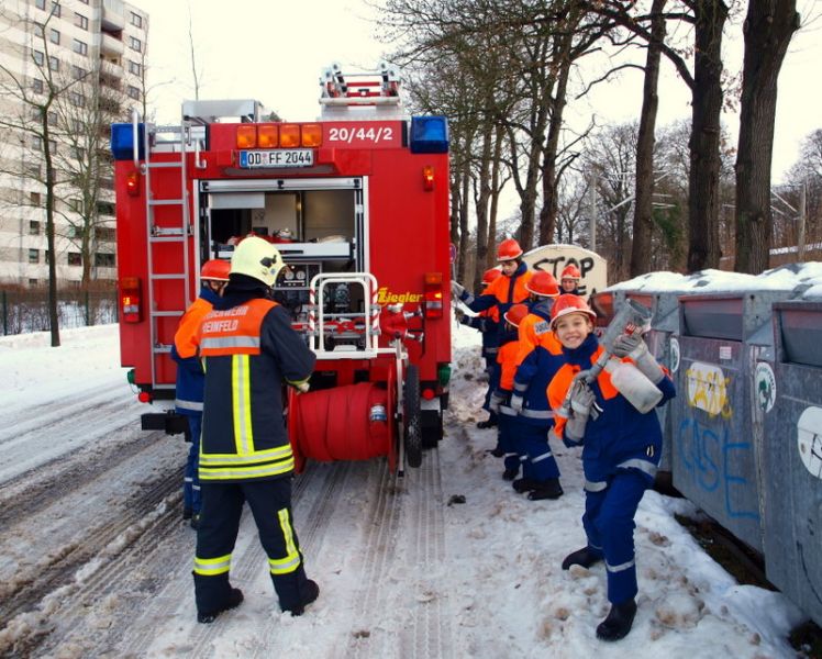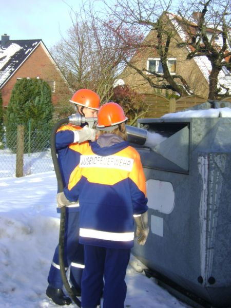 Gegen 10:00 Uhr war es mal wieder so weit: Wie jedes Jahr galt es, alle Papiercontainer in Reinfeld einzuschäumen, damit die "Großen" nachts nicht los müssen, um einen Altpapiercontainer zu löschen. Mit viel Spaß, aber etwas kalten Füßen, bewältigten wir die Aufgabe und gönnten uns nach getaner Arbeit noch einen warmen Kakao. Gegen 13:30 Uhr waren wir wieder zurück an der Wache und durften, nachdem die Löschfahrzeuge wieder sauber waren, nach Hause gehen.