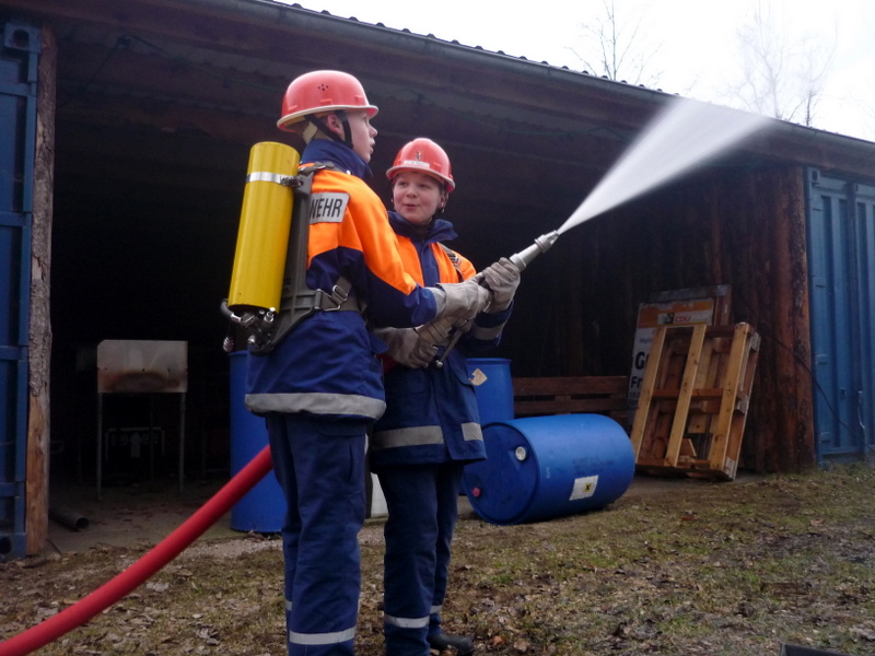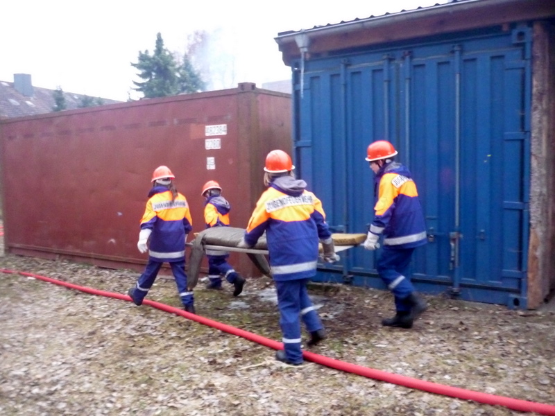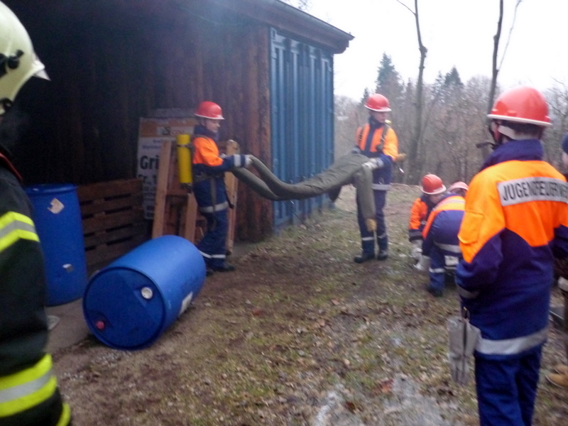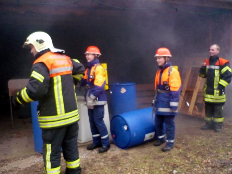 Für die Übung am letzen Freitag hatten sich die Betreuer etwas besonderes für die Jugendlichen der 2. Gruppe ausgedacht: Sie sollten einen Einsatz abarbeiten, bei dem zwei Personen in einer brennenden Werkstatt vermisst wurden. Die Jungen und Mädchen gingen mit den selbstgebauten "Atemschutzgeräten" und einem Strahlrohr vor. Der Rest kümmerte sich um die Wasserversorgung und um die Verletzten. Mit viel Spaß und Freude arbeiteten die Jugendlichen den Rest des Einsatzes ab.