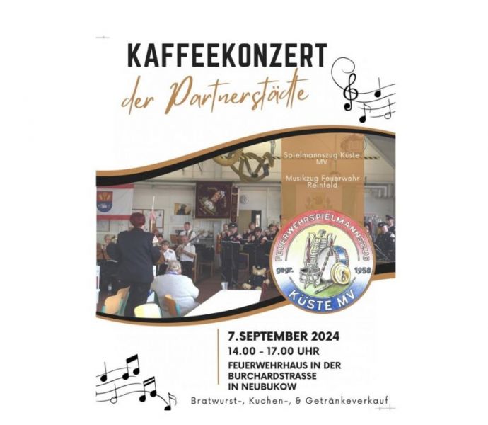 Das Kaffeekonzert 2024 fand dieses Mal Anfang September statt. Der Musikzug der FF Reinfeld und der Musikzug Küste präsentierten ihr musikalisches Repertoire. Traditionell präsentierten die beiden Musikzüge auch die Stücke "Alte Kameraden", "Mars der Medici" und "Der treue Husar" zusammen.